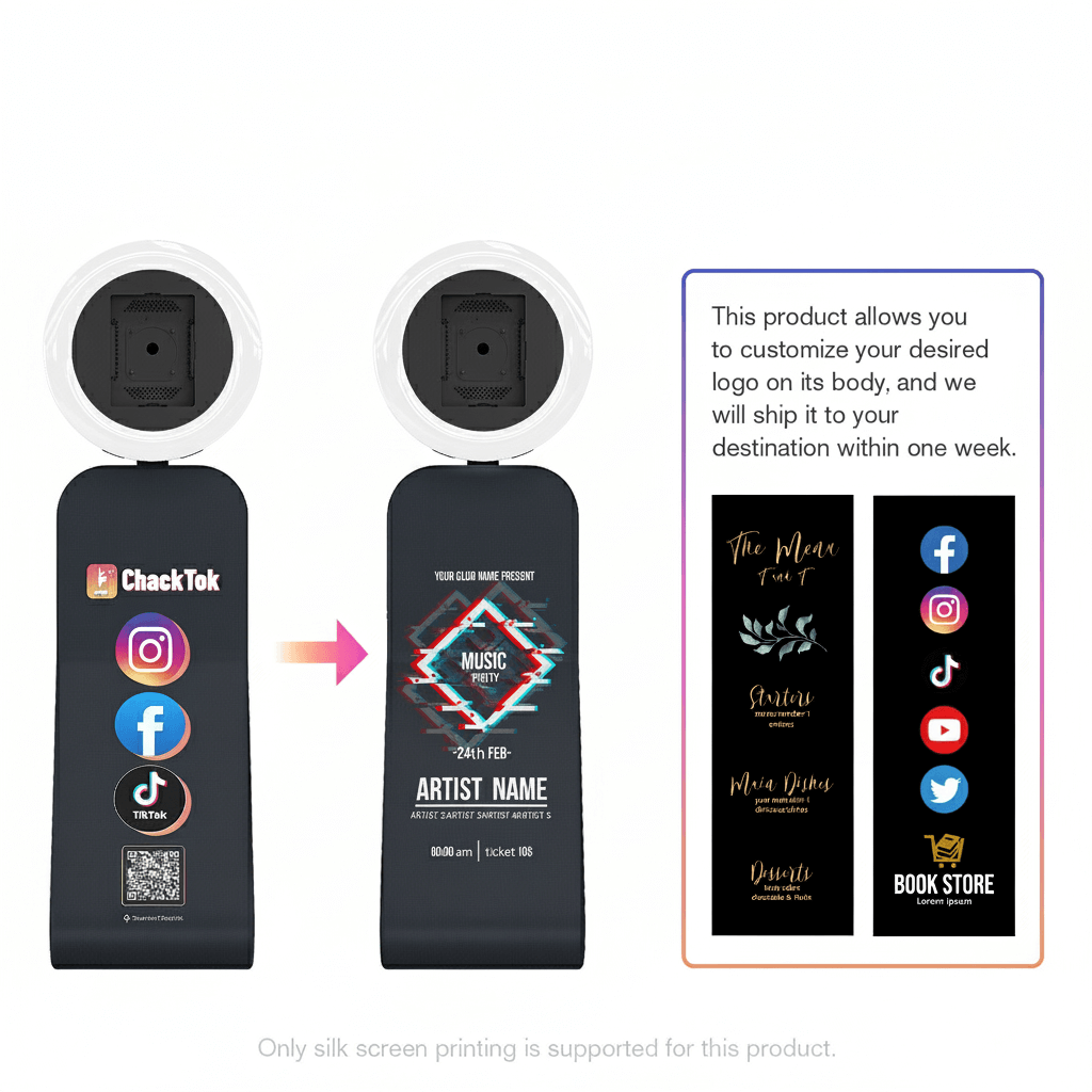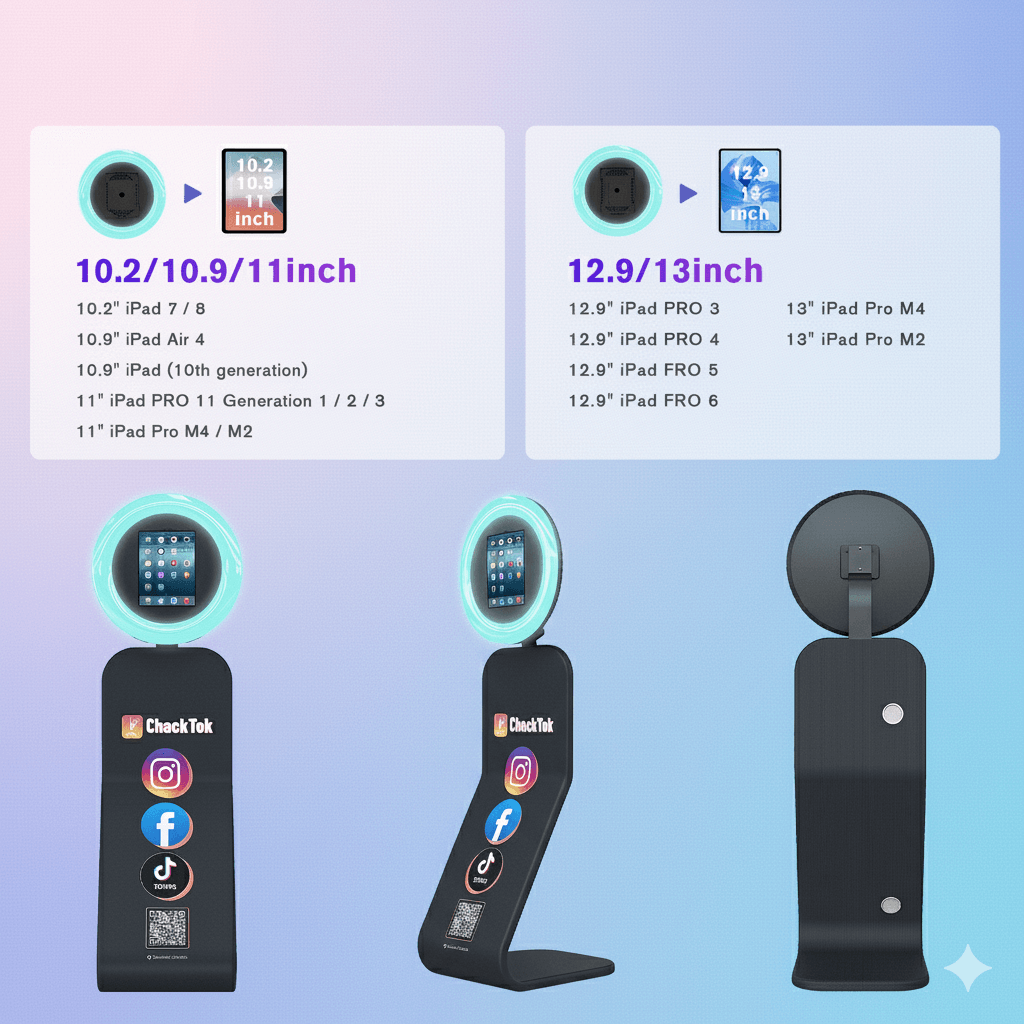 Meet the ChackTok iPad Photo Booth Lite — designed for creators who move fast but demand professional impact. Weighing under 15 lbs, it folds neatly into its premium carrying bag and sets up in minutes. Perfect for weddings, parties, and branded activations, it combines portability, stability, and style in one sleek system — powered by your ChackTok VIP APP.